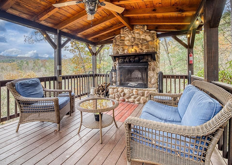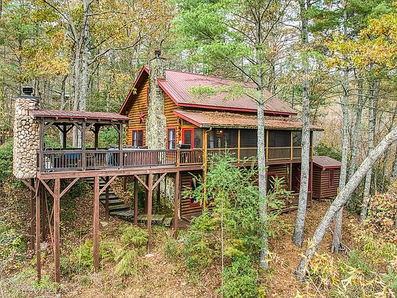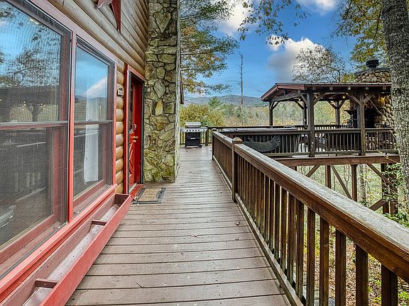 Spacious and amenity-filled 4 bedroom, 3 bathroom true log cabin, with incredible layered mountain view and close proximity to downtown. Designed for comfort and privacy, with at least 1 bedroom and bathroom on each level. The spacious master suite is located on the upper loft level and features a full bathroom with stone shower. The main floor offers a king bedroom with mountain view and large bunkroom which sleeps 4 comfortably. There is also a full hall bath on the main level. Take in the view from the screened in porch or even better, from the hot tub or covered party porch with stone fireplace. The lower level features another king bedroom, full bathroom and gameroom. Outdoors there is a firepit, covered parking area and additional parking spaces. Experience spacious end of the road privacy with 2 lots and is only 5 miles to downtown Blue Ridge in the popular Cherry Log Mountain Neighborhood. Boasting amazing rental history of $88k/year, this would make a lucrative investment property, or peaceful vacation retreat. There is a mixture of paved and gravel roads to reach this cabin. Rental calendar has been blocked for showings 11/11 - 11/14. Seller will not accept offers before 11/15. AGENTS, PLEASE do not sue showing time. Rental link in docs.