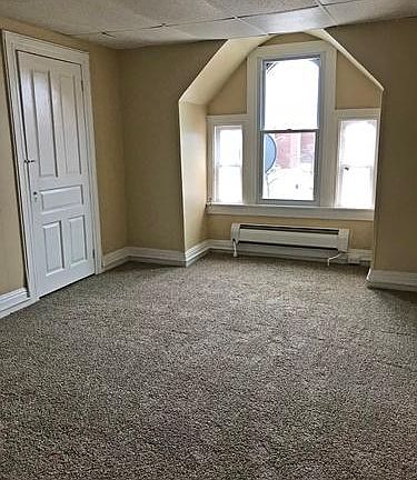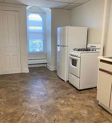 3rd floor, 1 bedroom 1 bath apartment with living room and eat-in kitchen with stove and refrigerator. New flooring in kitchen and new carpet in living room and bedroom. No pets. No smoking indoors. Tenant is responsible for electric and gas.