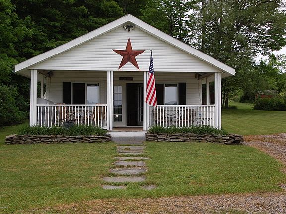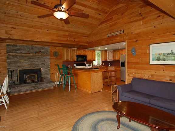 Super charming lakefront cottage at beautiful Lewis Lake. Over 92' lake frontage for this level 0.45 acre lot. Cottage offers spacious 22x10 covered front porch for outdoor entertaining. 16x22 living/dining room with pine tongue-n-groove cathedral ceiling, field stone fireplace with wood burning insert. Open to large kitchen. Two cozy bedrooms plus a bunk room, & separate laundry room.