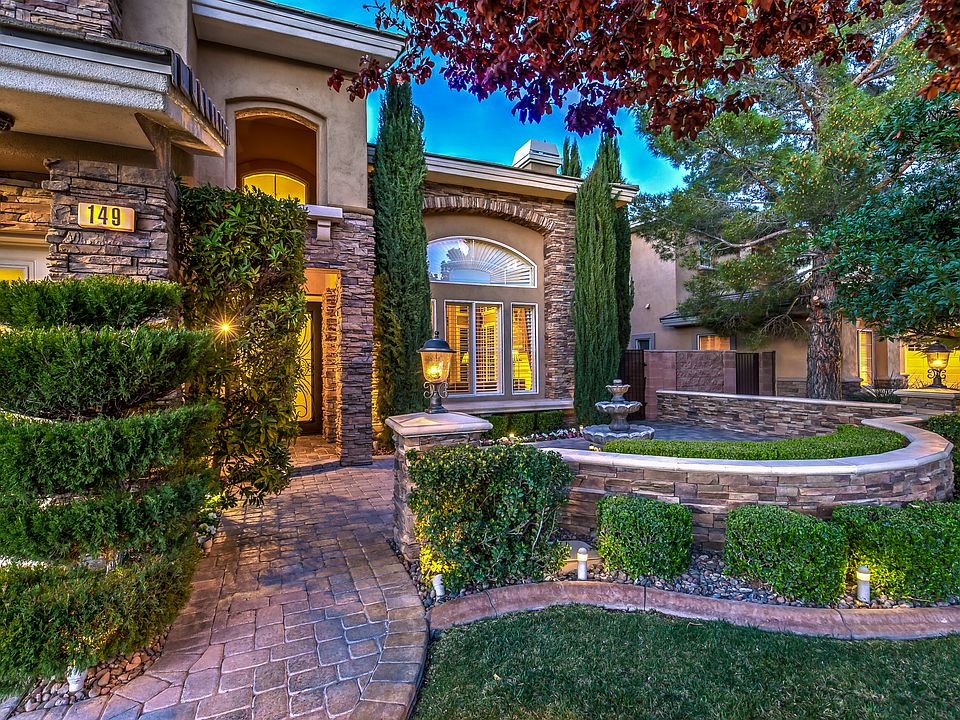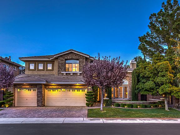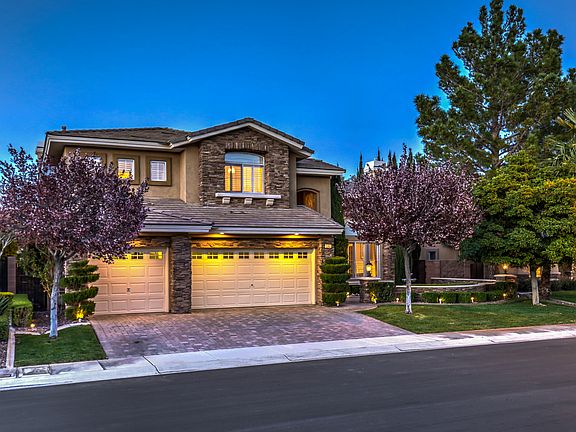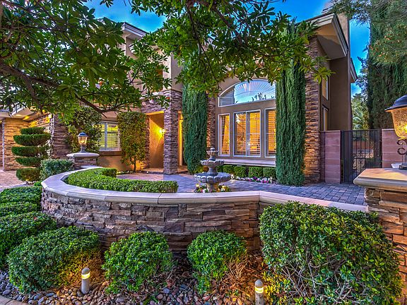 This beautifully appointed home resides in the sought out neighborhood of Talon Pointe, a gated luxury community nestled in the middle of Summerlin's The Canyons Village. Walk up to the stunning stone exterior and enter through the custom iron doors leading into a grand two-story foyer revealing the dramatic iron staircase. This impeccable home boasts an upgraded chef's kitchen featuring stainless steel Wolf appliances, SubZero refrigerator, granite countertops with backsplash, and a wine closet with custom racks. The open floor plan provides great utility of space making it ideal for entertaining. The massive master suite serves as a serene retreat showcasing a remodeled bathroom with polished travertine floors and marble counters, raised spa-like tub, enclosed walk-in shower and a private office revealing gorgeous mountain views. The welcoming courtyard, manicured mature landscaping, along with the paver hardscape throughout add to the beauty of this home. The backyard is an entertainer's dream, showcasing a heated pool and spa, covered patio and alumawood pergolas, elevated sitting area with fire pit and a gourmet outdoor kitchen with a custom built-in Viking BBQ complete with double side burners and an oven. Your new home awaits!