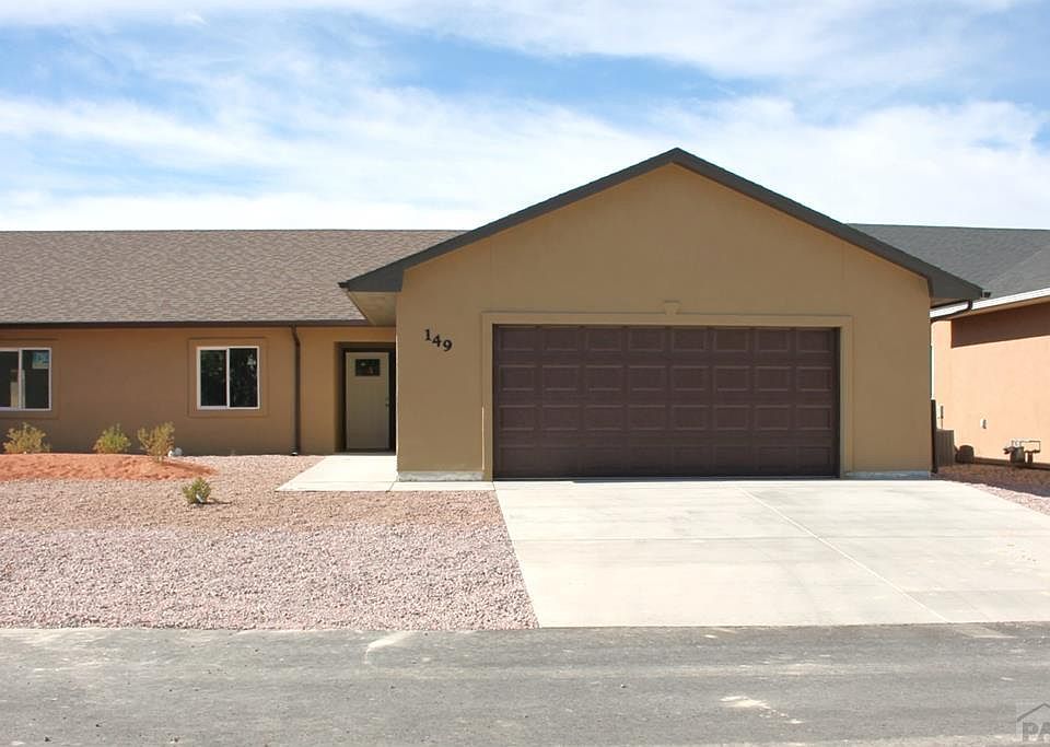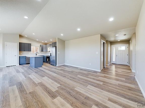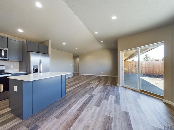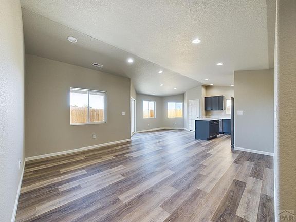 New construction in Pueblo West close to the Desert Hawk Golf Course and shopping. Three bedrooms and two bathrooms split bedroom design. The kitchen features soft-close cabinets with quartz countertops, a kitchen island, and black appliances. The kitchen has an open concept to the living room, with luxury vinyl tile and a vaulted ceiling. The primary bedroom has carpet flooring, a walk-in closet, quartz countertops, and tile bathroom floors/tile bathroom surround. The other two bedrooms share a full bathroom with the same amazing finishes! Enjoy the outdoor space with a covered back patio. Landscaping in the front yard will Be Xeriscaped with rock, Bushes, and a drip.