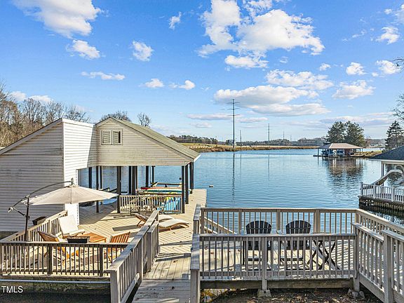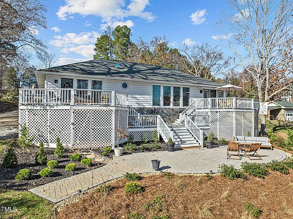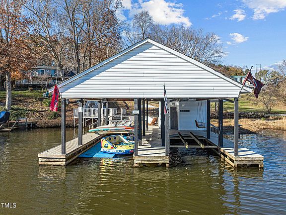 REDUCED! Driving under the charming, covered bridge, winding down the paved driveway and you are welcomed at 149 Saint George Lane at Hyco Lake. Inside this 3 bd, 2.5 bath, 1848 sq ft home you will find one level living, oak hardwood, tile and new carpet flooring. The entry has a custom-built drop zone for extra storage. The open concept living room features floor to ceiling windows filling the space with natural light and views of the lake. The dining room has a built-in China cabinet and room for a substantial family dining table. The kitchen has granite counter tops with a custom eat-in breakfast bar. Stainless steel appliances including a Bosch dishwasher, a wine & beer fridge, abundance of solid oak cabinetry and two pantries. Right off the kitchen is a spacious laundry room with built-in ironing board, cabinets, and a full-sized 2nd refrigerator! Just off the dining area is the sunroom with floor to ceiling windows, currently used as a 2nd TV room, it would make a great home office. The sunroom leads directly to the new, large grilling/dining deck. A spacious master bedroom offers new carpet, a big closet, En suite bath, floor to ceiling windows with a large, private deck. There are 2 full sized garages, one used for car parking and the other used as a workshop, could be easily converted to an extra-large bunkroom or man cave. Outdoors you will enjoy the oversized decks, and a huge custom patio with fire pit. Beautiful landscaping throughout the yard; gorgeous mature Oaks, Magnolias, Azaleas and more. The gentle sloping walk to the water offers a deck walkway, a viewing landing, and a large dock with double boat slips! One slip for a pontoon, the 2nd slip is set for your ski boat. All brand new; steel beams, boatlift, and lift boards. The boat house has ample storage. New HVAC with smart thermostat and a 10-year warranty, new gas water heater with 7 yr warranty, new well pump & motor, new electrical, plumbing, paint, carpet, fixtures, grading, rip rap, exterior access doors and much more has been updated in this beautiful lake home! Spectrum high speed internet (2 separate incoming lines)! 500-gallon LP tank owned by the property. Great vacation rental! Rental history is available upon request, the house has received nothing less than 5-star reviews! Some furnishings convey, others negotiable. All offers considered.