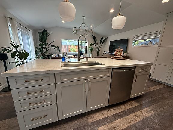 A beautifully updated home blending modern comfort with a tranquil backyard. This approximately 1,450 sq ft home features a bright open layout with a newly remodeled kitchen, updated quartz countertops and new cabinetry, stainless appliances, and a vaulted family room that brings in great natural light. The garage has been fully remodeled to include a workout center along with a newly built laundry room offering extra storage. Updated flooring, lighting, and finishes run throughout the home, giving it a fresh and modern feel.