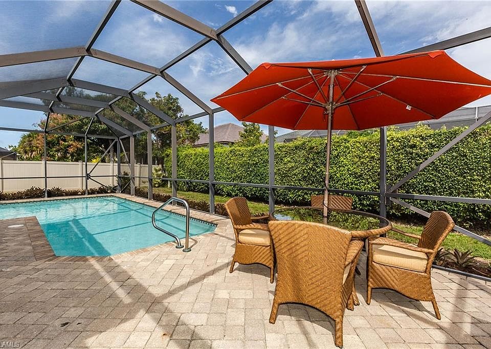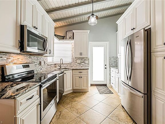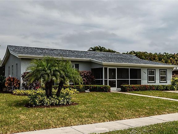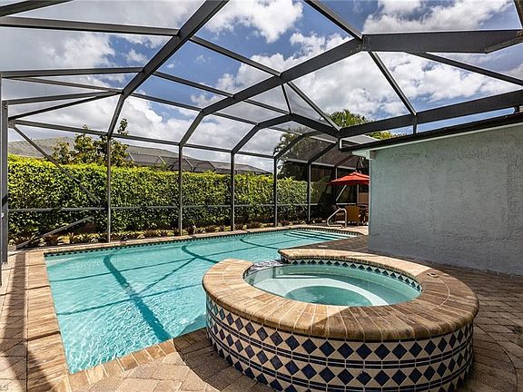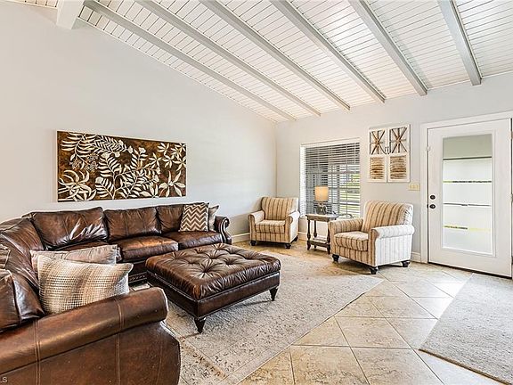 Recently updated with a coastal contemporary flair, this 3 bedroom/ 2 bath residence has 1,600+ sq ft with open floor plan. Main living area has cathedral ceilings with lovely exposed beams and diagonal tile throughout. Kitchen equipped with stainless steel appliances, white cabinets, grey/white natural stone backsplash & granite countertop peninsula breakfast bar. Master suite features plank tile flooring, electric fireplace with barn door entry to an updated bath with porcelain shower with natural stone floor. 2 sets of sliding glass doors open from family room to large lanai with pavers & screened cage enclosing free form heated pool & spa. Back yard offers much privacy with fencing & tall ficus hedge or enjoy gorgeous sunsets from the screened front porch sitting area niche. New roof in 2019, tankless hot water heater, stainless steel washer & dryer, built in cabinetry, guest rooms with bamboo flooring, updated guest bath, AHS home warranty & side shed adds storage, fruit tree and more. Only 1.5 miles to the beach! To view all photos click VT at top of listing for tour!