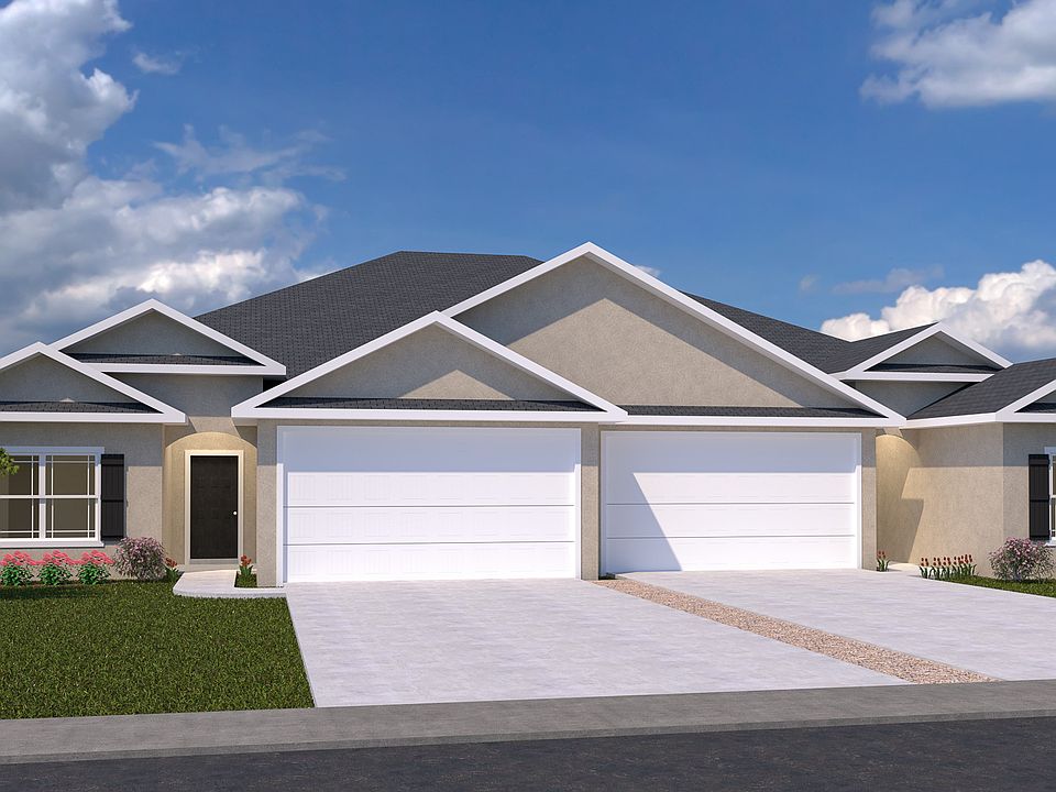 The Villas at Camden Woods, boasts a home with exquisite features. The kitchen comes equipped with custom cabinets complemented by 3cm granite, LED recessed lighting, under cabinet lighting, along with stainless appliances. You'll also find a spacious walk-in pantry and laundry room. The master bathroom is adorned with a walk-in tile shower, a sizable tub, and double vanities. The master suite is complete with a generously sized walk-in closet. Additionally, the garage is finished with t1-11 and provides ample flooring above for storage. HOA dues cover lawn maintenance and grant access to the pool and fitness center. Please note that the image is a computer-generated rendering.