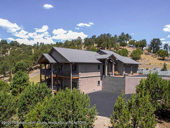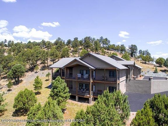 Unbelievable panoramic & Sierra Blanca views as you drive up to the end of Topside Dr, cul de sac, very private & secluded. Level entry into this fabulous 4 bdrm, 4 bath, upscale mountain getaway or great year-round home! Open living w/fireplace, framed TV on wall, lovely dining area flows to the back enclosed patio/courtyard & fenced yard area around the side for your furry, best friends! Spacious kitchen w/super breakfast bar, large pantry. Guest bedroom w/bath, office & beautiful master suite on main level. Wonderful master bedroom w/hot tub off master, large master bath. Den downstairs w/2nd fireplace, mini-kitchen, 2 bdrms, 2 baths. Level entry from double garage, thru laundry to main level of house. Decks off upper & lower levels & also, beautiful back courtyard!