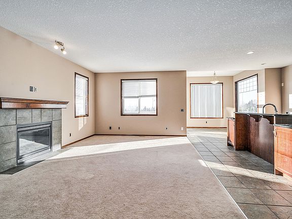 Spacious & Bright Layout: An open-concept main floor flooded with natural light, featuring a gourmet kitchen, dining nook, and cozy living room with a tiled fireplace.