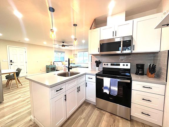 PET-FRIENDLY, FURNISHED, & UTILITIES INCLUDED, available for a minimum of 3-month rent. This peaceful ocean-themed studio will be your restful sanctuary. Recently remodeled, this home comes with 550 sq ft of open space, a new kitchen fully equipped with stainless steel appliances, a breakfast island, and all the essential kitchen wares. Make this your home away from home with a bright and airy bathroom, king-size memory form bed, separate dining area, and a spacious sectional couch. Access to the side yard and assigned parking. Parking: Assigned parking is available in the long driveway behind a manually opened short metal gate is available to guests in unit B. The long driveway can be tendon parking for 2 small vehicles or 1 truck or SUV. Please do not block the sidewalk off the street. Laundry: Guests have access to a washer & dryer in the adjacent laundry room, which is shared with guests in unit A. Laundry detergent and fabric softener are provided. Neighborhood This is one of a 2-unit home in a residential neighborhood. The front unit is also a short-term rental. Centrally located within quick access to HWY 880, 238, and 580, this home is only a 5-minute drive to the lovely downtown Castro Valley, where you will find artisan marketplace, shops, restaurants, banks, and cafes. About a 10-min drive, or a short bus ride (the bus stop is around the corner) to Hayward BART & San Leandro BART station, making it easy to visit San Francisco. Property features: - open and spacious studio (550 sq ft) with a king bed, sectional couch, and a separate dining area with a 4-person dining set. - flat screen smart tv with streaming app Netflix, Amazon Prime, Disney Plus, HBO, Hulu, and much more. - high-speed wifi available to make this a great working space -Ceiling fan, A/C & Heat - newly remodeled bathroom comes with shower over tub, vanity sink, dual-flush toilet - fully equipped kitchen with stainless steel electric range stove, microwave, a full-size fridge, coffee maker, and kitchen essentials (4-person dining ware, glassware, pots & pan, baking ware, a Knife set, oil, salt & pepper. - access to the sideyard - shared laundry room with new washer & dryer. Laundry detergent and fabric softener provided The rent of $2650/month includes a furnished studio with a fully equipped kitchen. Utilities and internet included. A minimum of a 3-month lease is required.