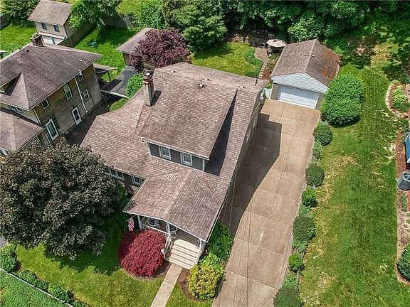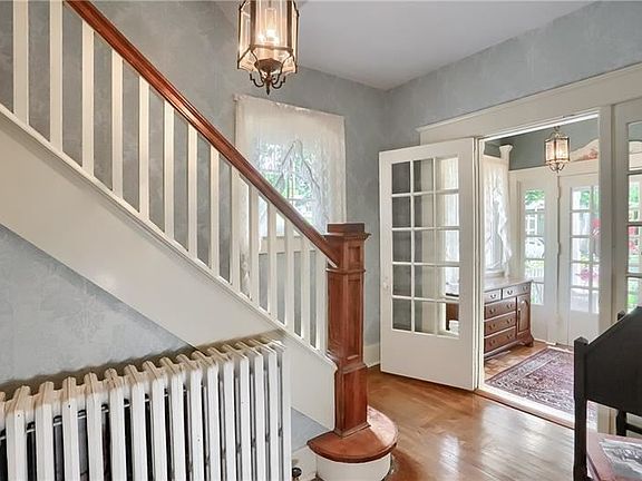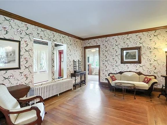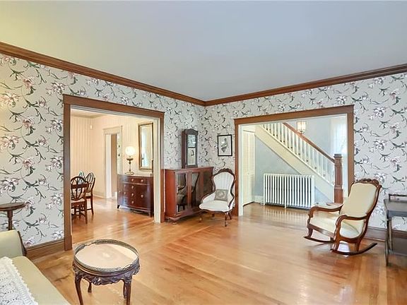 Charming home w/abundant character, new windows, generous room sizes, solid wood doors, original hardwood flooring & ornate details impress. Immaculate curb appeal as you enter double French doors. Sprawling hardwood flooring, 9-foot ceilings, highlight the home. Huge family room leads to elegant dining room. Bright & airy kitchen w/antique stove, endless counters, ample cabinetry, ceiling fan & sunny breakfast room w/outdoor access. Main floor has a parlor & versatile sitting room. Main floor primary suite is graced w/hardwood and private spa bath. Ascend to three large guest bedrooms w/hardwood, walk in closet, sun filled window, crown, & ceiling fans. A shared hall bathroom has a tub/shower combo, bright window & modern vanity. Finished lower level has versatile space, partial bath, laundry & oversized storage rooms. Private, mature back yard with stone accent wall encompasses a quaint sitting area. A detached garage and expansive aggregate driveway provide storage and parking.