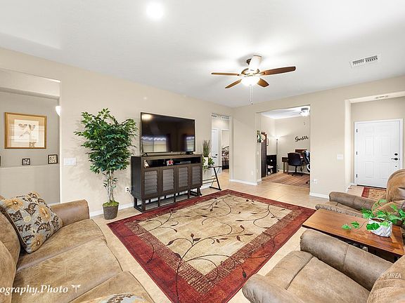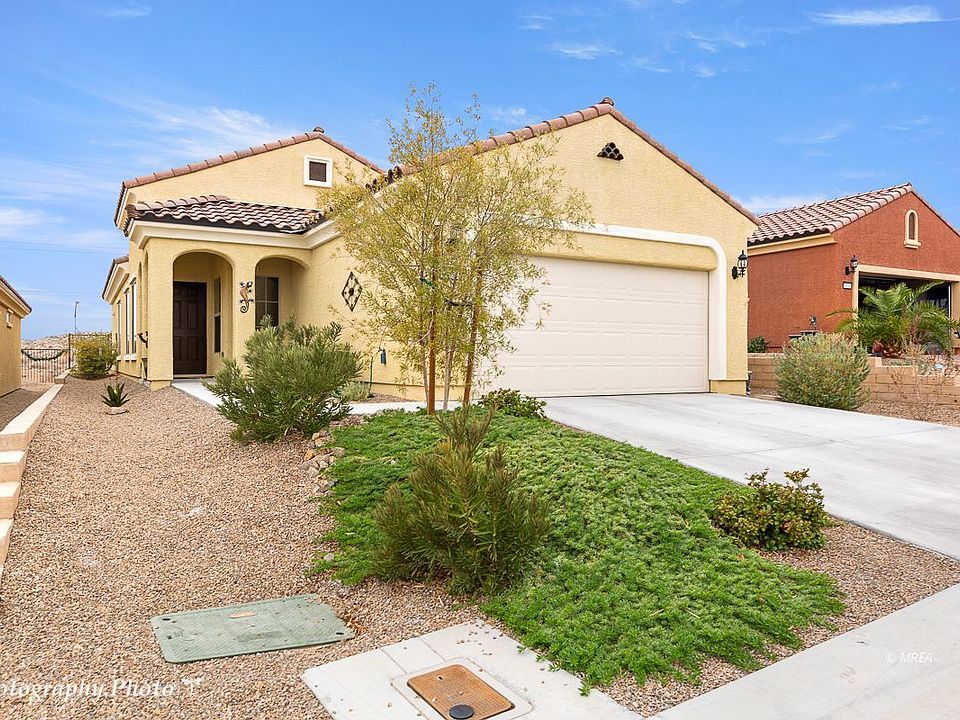 Beautiful views of Flat Top Mesa and the Virgin Valley Mountains to the south. Popular ASTER FLOOR plan. "Tiled throughout" the entryway, living room. kitchen, dining and bathrooms. FULLY FURNISHED !!! Great southern orientation of the backyard....views of the mountains. SID will be paid in FULL at COE by the seller. Like NEW....very well cared for. Kitchen has granite counter tops and Stainless Steel Appliances. NO NEED TO WAIT 10-11 MONTHS TO BUILD. Seller can accommodate a quick close. Bring us an offer. Master bathroom has "upgraded" with a custom tiled walk-in shower and thick glass entry door. Master Bedroom has beautiful views of the mountains to the south. Guest Bedroom is already furnished and ready for your guests. DEN has windows that look northward that brings in lots of natural light. Another BONUS the Washer and Dryer are included. Professional photos will be added by December 9th of the interior of the home.