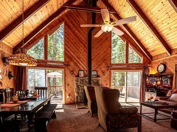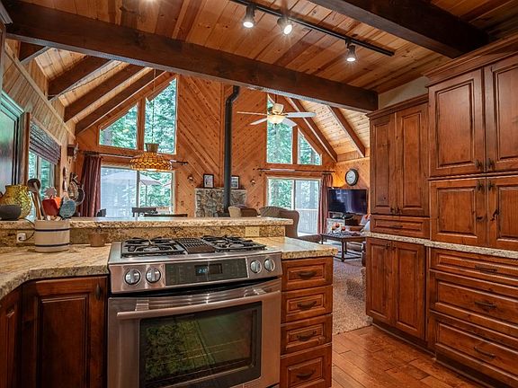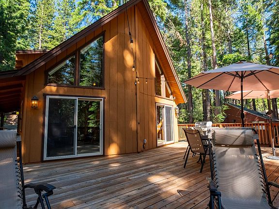 This carefully maintained and lovingly cared for chalet cabin has been gorgeously remodeled and is ready to move your family into! The turnkey, 4 bedroom, 3 bathroom cabin backs up to a private forest and comes complete with smart home capabilities allowing for remote control of lighting and thermostats from your phone. While at the cabin voice commands to several Apple HomePods control lighting scenes, play music, Apple TV and thermostats. Filled with high end furnishings and recently upgraded top of the line mattresses, this cabin leaves nothing to be desired! The fully remodeled, gourmet kitchen boasts custom alder kitchen cabinets, tumble edged leather granite and hardwood floors. The bonus room downstairs offers a bunk room with 4 XL twin beds and a home theater tv system with high-end center and main speakers by Bowers & Wilkins. From the expansive living room with beautiful vaulted ceilings, you'll love to step out to the recently updated and expanded 580 square foot deck, where you can relax and take in all that nature has to offer. Lastly, there are 3 Tesla Power Walls (battery backup) and 2 plugs for EV vehicles, installed in 2021. Don't miss the virtual tour!