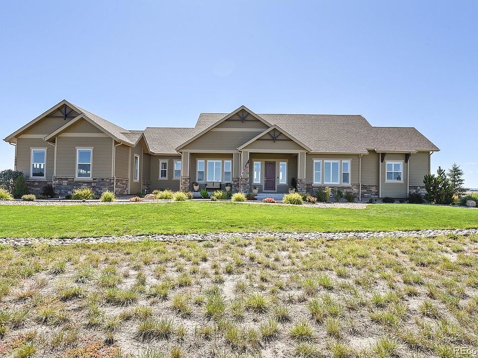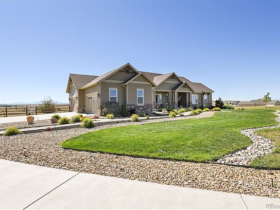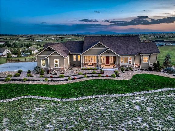 Have you been searching for a five acre ranch style home with gorgeous Pikes Peak views and amazing sunsets Search no more! This home is on one of the best view lots in Wild Pointe Ranch. Entertainers dream home with open floor plan and main level primary suite will not disappoint. As you enter the home you will be greeted with lots of natural light, high ceilings, and views from every window. The kitchen has professional grade Viking stove, gorgeous custom cabinets with soft close doors and drawers (throughout the home), granite counters, walk-in pantry, and dining nook that opens to the full length back trex deck with covered seating area. The great room has a floor to ceiling stone fireplace for those Colorado winter nights. Primary bedroom includes large walk in closet, bathroom with dual vanities and additional make-up vanity, oversized shower and separate tub. Finishing out the main level is a formal dining room, office with French doors, mudroom with built-in bench, and laundry room with sink and large storage area. In the walk-out basement you will find two large bedrooms with jack/jill bathroom on one side and on the other is a family room with fireplace leading into a wet bar/kitchenette area and an additional bedroom and full bath. Plus there is an additional 400 sq feet of storage room. So many wonderful upgrades: 4 zone HVAC, tankless water heater, custom Elfa shelves & drawers in closets. The walk-out basement leads to a covered patio that also enjoys the Pike's Peak view, organic garden area (12 boxes) plus once acre fenced in yard. Must see to appreciate all the great features of this property! Enjoy country living yet close to shopping, restaurants, and the historic town of Elizabeth. Check out the Virtual Tours for aerial video, 360 Tour and floor plan.
