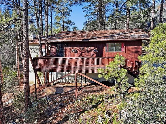 Nestled on 1.88 serene acres of Ponderosa pine and juniper forest, 1490 White Spar Road in Prescott, Arizona, offers a rare blend of privacy, rustic charm, and natural beauty. This approximately 2,000-square-foot home, built in 1976, features three bedrooms, two full baths, and an additional three-quarter bath, providing comfortable and flexible living space. The interior includes a warm, inviting living and dining area with a wood-burning fireplace, and a finished partial walk-out basement that can serve as extra living space, storage, or a workshop. A mix of wood and vinyl flooring adds to the home's cozy, rustic character. Outside, the property's expansive decks and covered outdoor areas create peaceful spaces to relax and enjoy sweeping views over the surrounding forest. An additional 288 sq ft guest house for all of your extended family visits compliments this wonderful home. With a fully paved access roads--privately maintained--the home feels like a secluded mountain retreat while still being conveniently close to Prescott amenities. The 1.88 acre lot provides ample room for expansion, gardening, outbuildings, or simply enjoying the tranquility of your own private woodland. This property offers tremendous potential for someone seeking a quiet mountain lifestyle or a unique forever home surrounded by nature.