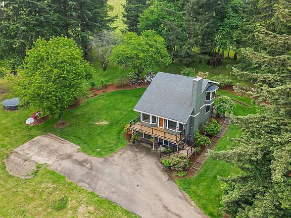 Serene countryside oasis surrounded by vineyards, this stunning chalet like home sits on 2.5 acres in a quiet hillside community just 5 minutes from Newberg, and 10 minutes from Sherwood, giving you country living without sacrificing the amenities of town. The gated 3 bedroom, 2 bath, 1,784sqft home is the perfect sanctuary with an ideal location amid hobby farm neighbors. Quality built by original architect owner, open kitchen to dining layout and vaulted living room with direct access to territorial views from the new Trex deck. Gleaming hardwood floors, built in bench seat and wood-clad windows throughout; a cozy central fireplace, loads of kitchen cabinetry for your storage needs, stainless steel appliances and the picture-perfect kitchen window overlooking pastoral views. Primary on main level with adjacent outside entry access to private park-like back patio. The upstairs bedrooms share equally delightful views, taking in the abundance of beautiful landscaping and zest for outdoor living. Lower-level den plus utility and laundry room, suitable office space or additional storage as it connects to the two-car tandem garage. Outside amenities include fully fenced and landscaped yard flanked by beautiful mature shrubs, over-sized firepit, a variety of fruit trees, chicken coop, solar panels, new Hardie Plank exterior with transferrable warranty, community water and private septic. This home is a unique and rare find, an excellent value opportunity to invest and gain equity in Oregon wine country.