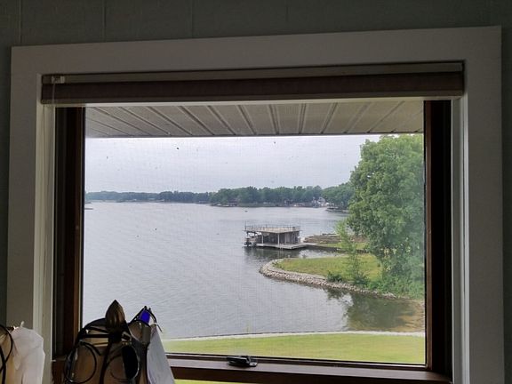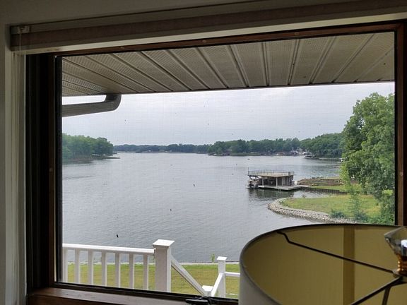 One of the best locations on the lake with panoramic main body views and over 700' of steel seawall. Large double slip boat dock with party deck and approx 50' of beach. This home has the best of both water worlds; a nice quiet swim cove on one side and main body views and access on the other two sides. Quality built home in excellent condition. Huge upper level deck runs along the entire back of the home. Lower level concrete terrace from family room walk-out. 2 year round sunrooms, one on each level. Greenhouse and detached two and a half car garage as well as single car attached. This property has deep water yearround! Three fireplaces, one in the master bedroom. Nice private master suite with tub and shower and walk-in shower. All furniture stays, including the pontoon boat. Just bring your clothes and move in!!