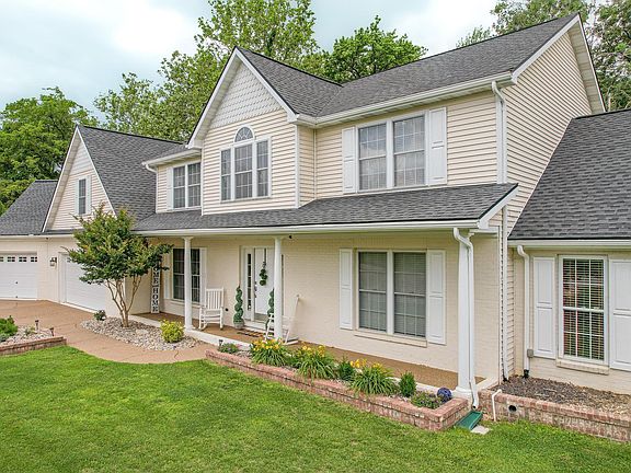This charming two-story traditional home offers 5 bedrooms, 2.5 bathrooms, and a spacious, light-filled layout perfect for everyday living on Evansville's North Side. The main floor features a grand double-height foyer, beautiful hardwood flooring, and a stunning living room with soaring ceilings, a gas fireplace, and oversized windows. The eat-in kitchen includes stainless steel appliances, custom cabinetry, a breakfast bar, and easy flow to both the main living space and a second living room through French doors. A formal dining room with elegant columns sits just off the entryway. The primary suite is conveniently located on the main level and includes vaulted ceilings, direct access to a private patio with pergola, and a full ensuite bath with jetted tub, standing shower, and double vanity. A half bath and laundry room complete the first floor. Upstairs, you’ll find four additional bedrooms—one with built-in shelving—and a full bath, plus a versatile bonus room and mezzanine that offers space for a home office. Set on over half an acre, the landscaped yard features lake views, a spacious back patio with an oversized pergola, a side patio, and a welcoming front porch. The attached three-car garage adds even more convenience. With generous room sizes, ample storage, and a quiet neighborhood location close to top schools and shopping, this move-in-ready home checks all the boxes.