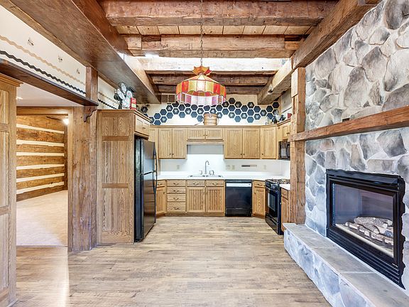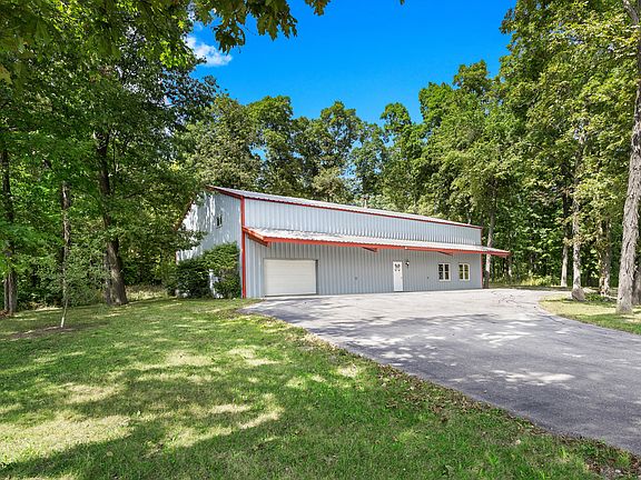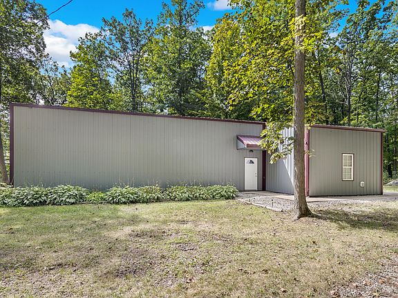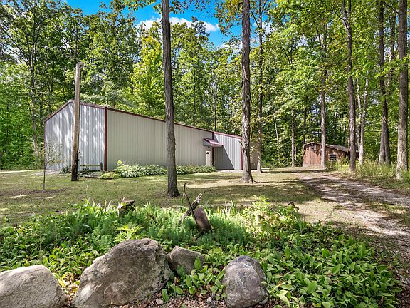32 wooded acres includes a 10 acre natural spring pond. The property is split into 2 parcels. One is 22 acres and the other is 10 acres. There are 3 structures on the 10 acre parcel in a beautiful setting with views of Lake Dianne and 75' easement rights to put a dock on the lake. See plot survey in the pictures for specifics. The first structure is steel frame construction (45' x 75') featuring a 7.5'' insulated interior crafted from large Ash, Hickory and Walnut Hand Hewn Beams reclaimed from a historic 1853 Lauber Hill area barn. Paved semi-circle driveway in the front, large great room at the entrance with a wood burner which heats the entire home and tons of hand hewn beams throughout. Custom Beaded Oak Cabinetry throughout home by Clancy's Cabinets of N/W Ohio, custom built beehive inspired desk area, additional stone, gas fireplace with Walnut Mantle, huge walk-in kitchen pantry, Anderson Windows, High Efficiency furnace, A/C, gas stove, washer and dryer, (more)