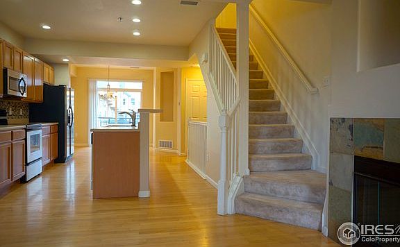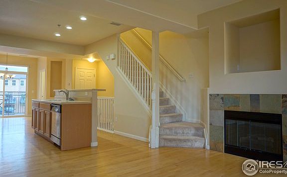 Stunning 2-story in this well maintained townhome style condo located in the desirable village at City Center. Oak floors and entire main level and comfortable paint scheme. Awesome kitchen featuring maple cabinets, glass tile backsplash, stainless appliances and island with sink that dominates the center of the space. Open to family room with gas fireplace. Two Master Suites Upstairs. Two Balconies. Finished Lower Level. 1-Car Garage. Community Pool. Walk to Main Aurora Rail and Bus Station.