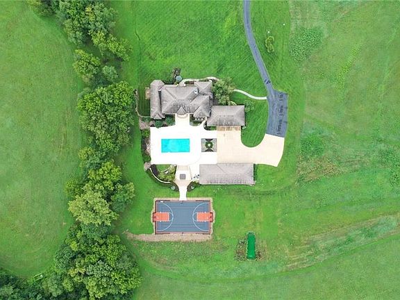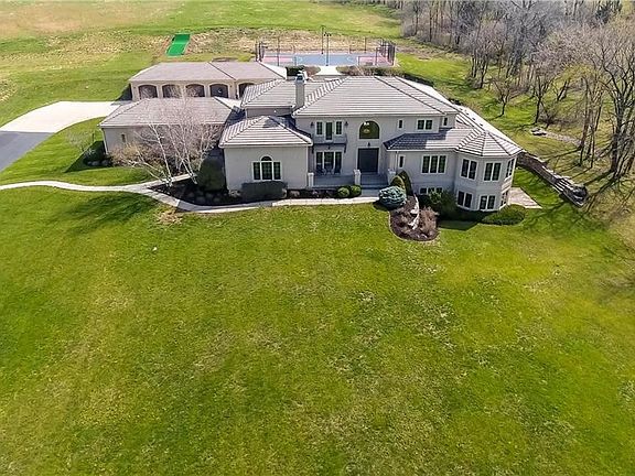 Custom Estate designed by Architect Wolfgang Trost. Main level w/large gourmet Kitchen opens to Living rm, Formal Din., Great Rm, BR w/ private bath, Office, Master Suite w/coffee bar, His/Hers Closets. MBA w/Steam Shower, heated tile floors. Upper level has 3 Large BR's, Loft w/built-ins, Views of the acreage & pond. LL has Full Kit, Rec area, BR & Full Bath, huge storage area. Laundry Rm on all 3 levels. 4 Acre pond, Pool, Cabana, Outdoor fireplace, Hot Tub, BBall/tennis Court. 7 Car Garage & Gated Entrance.