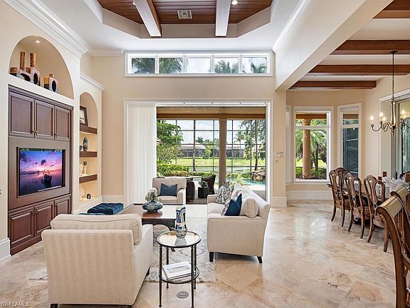 The arched entry door leads you into the foyer of this stunning villa offering you all the amenities you desire for living the golf course lifestyle in paradise with shimmering lake views. As you head down the gallery hallway, you are swept away by the custom details including the volume ceilings adorned with crown moldings, applied molding, tray and exposed beam accents, arched passageways, architectural niches, extensive windows, French doors, wet bar service area and gorgeous stone flooring laid on the diagonal throughout the main living areas. The rock adorned spill over spa cascades into the negative edge tropical pool creating a serene water feature in the professionally landscaped screened lanai. Adjacent to the loggia is the separate covered summer kitchen is complete with a sink, built in gas grill, lower storage cabinetry and granite topping the work surfaces and bar seating. This tremendous villa was designed for endless luxurious living and entertaining opportunities with serene sparkling lake views as the perfect backdrop.