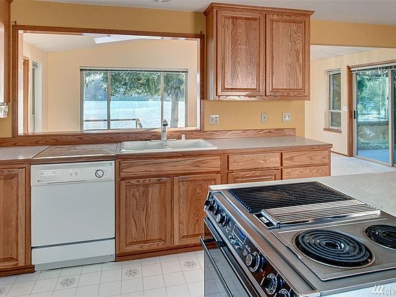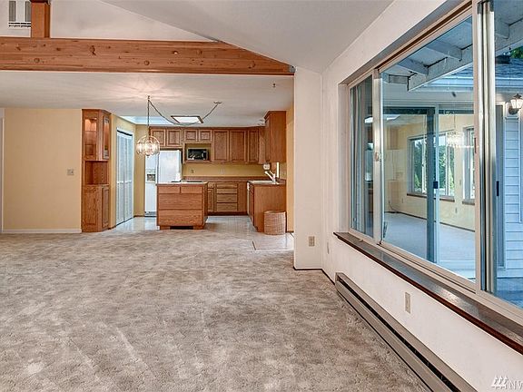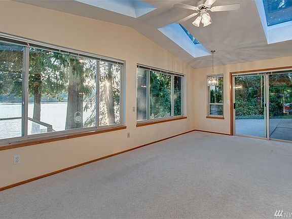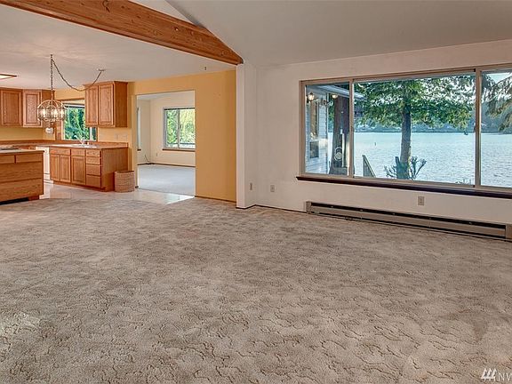 Delightful waterfront rambler on Lake Shoecraft, nestled on over an acre. With an abundance of windows and an open concept layout in the main living space, this home fully maximizes the stunning lake views. The kitchen, complete with a pantry, center island, and skylight, overlooks a dining area and spacious living room, showcasing dramatic vaulted ceilings. The dining area opens to a large sunroom, drenched in natural light and boasting panoramic views. The master bedroom features a walk-in closet, en suite bath and private access to the lakefront. Unwind on the glass-paneled deck, overlooking a manicured yard that softly slopes to the water?s edge. All these features, plus two additional bedrooms and full bath, a 2 car garage, RV parking and private dock ? this home is truly a sparkling waterfront gem.