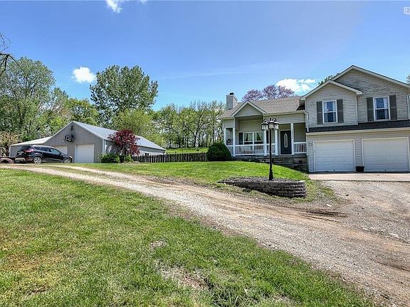 Enjoy living on the outskirts of town. Large 50X40 outbuilding ideal for workshop, home to your off road vehicles or entertaining in the game room with pool table & wet bar. Partially fenced in yard & several outdoor living areas from the brick patio, deck or front porch. Updated kitchen with gorgeous built-ins, multiple pantries, vinyl plank flooring & tile backsplash. Ceiling fans in all bedrooms, Master with private bath, Lower level has additional living space, Full bath & 4th bedroom. Minutes to I29 & KCI.
