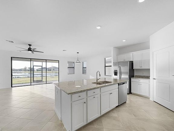 Single-story, about 2,201 sq ft of living area. 3 bedrooms, 3 full bathrooms. Flexible "den" space (can be used as office/4th bedroom).. 2-car garage. Entry leads into a foyer. Off the foyer: one bedroom + bath, good for guests.Den near the front area can adapt. Open-concept kitchen + great room toward the center/back, flowing into a covered lanai/outdoor space. Owner's suite tucked toward the rear for privacy: includes dual walk-in closets, soaking tub + separate shower. Other full bath(s) near the other bedrooms.Laundry/utility area accessible from main corridor. All one floor: no stairs to worry about. Good separation, owner's suite at back, guest/den in front. Big open living space + outdoor lanai: great for entertaining or Florida lifestyle. Since lanai is at back, you will enjoy lake view and beautiful FL sunsets.