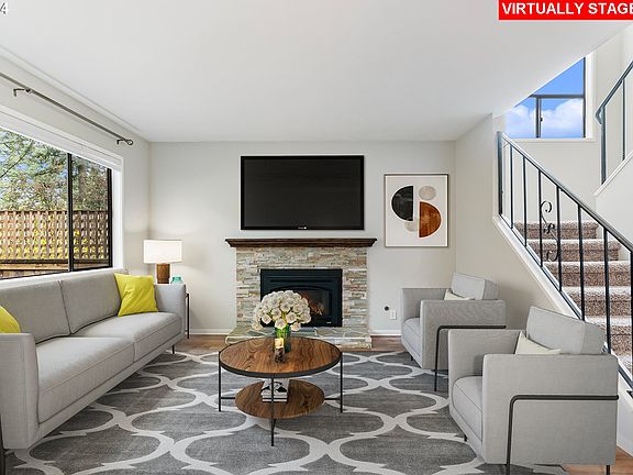 JUST LISTED! Updated end-unit townhome with desirable 2 bedroom + office floorplan. Two bedrooms upstairs with two full baths. Den on main has desk and built-ins included and can be a second living space or guest room. Features include thoughtfully remodeled kitchen with stainless appliances and breakfast bar, new carpet throughout, and gas fireplace with stone surround. Front courtyard has room to plant a garden. You will love the spacious back yard that is fenced and private. It is perfect for relaxing or entertaining. 2-car detached oversized garage with workbench and 200 sqft storage loft has something for everyone. Take a dip in the nearby community pool. Comes with all appliances included stainless kitchen refrigerator and main floor washer and dryer. Don't miss the large storage closet on the main. This home has it all and is priced to sell!