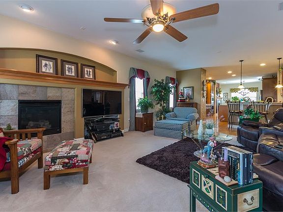 Great price for home on the golf course! Newly painted and new carpet installed..Immaculate condition shows like a model..Ready to move into..turn key..enjoy! Kitchen sports cherry cabinetry with pull out shelves and a kitchen island & breakfast bar, central vacuum & dust pan, 2 fireplaces. Large master suite with tray ceilings 5 piece bath with walk in closet. . Home over looking the second tee box with golf course views and beautiful sunsets! Outside covered patio is 700 sq ft flagstone patio overlooking perennial flower beds. 2 large covered patios. Tandem garage/ With tons of storage in upper attached cabinetry & painted epoxy floor. Upgrades include new paint, new carpet,double French doors and extra installed hardwood flooring Basement is wide open for your plans.. built in storage shelves.