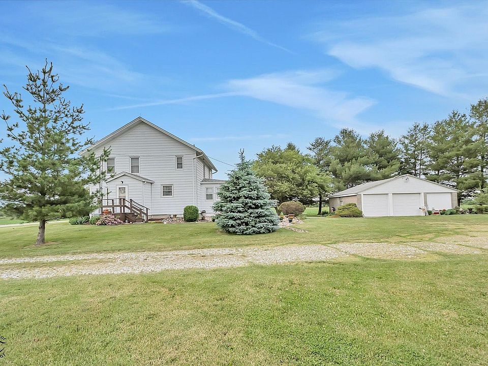 Welcome to this charming 4-bedroom farmhouse, offering 1,942 square feet of cozy living space with beautiful hardwood floors on the main level and a spacious three-car garage, all nestled on the beautifully landscaped setting in the desirable Crown Point school district. This peaceful rural retreat is perfect for family gatherings, outdoor adventures, or simply enjoying the quiet of country living. Stroll through multiple floral gardens or unwind with your favorite beverage in one of the serene sitting areas.A true highlight of the property is the impressive 34' x 62' barn with new garage door with opener--ideal for potential income storing vintage cars, boats, or campers beyond current crop income. Upstairs, the open loft features a basketball hoop, creating a fun space to shoot hoops year-round, rain or shine. Adjacent to the barn, you'll find a separate workshop or cozy sitting room--perfect for creative projects, relaxing with a book, or entertaining guests in a unique space.The home has already been pre-inspected, with the current owner addressing major findings including replacement of windows, new gutters on the three car garage, updates on electrical among items upgraded, so you can move in with confidence and start enjoying everything this inviting property has to offer.
