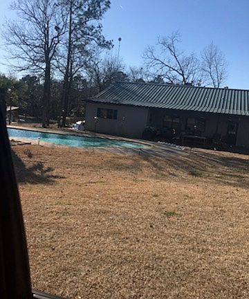 It is a beautiful log cabin with a metal roof, with 6 out buildings, a stocked pond and a salt water pool.