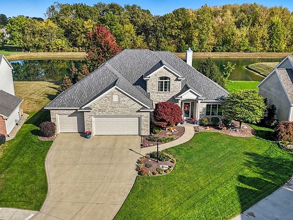 Open Wed, 10/22/25, 3-6pm. Tucked away in the Lakes of Jonathon's Landing, this one owner Windsor built 2 story will be a dream come true for the lucky new owner. It sits on a beautifully landscaped cul-de-sac lot with a gorgeous pond view. You will enjoy summer barbecues from a large 2-tiered deck and spacious stone block patio complete with a firepit and flowing stone waterfall fountain. The meticulously maintained lawn is kept bright green by an inground sprinkler system. The front elevation is enhanced by an all-brick facade, 2-year-old roof and newer replacement windows. Moving inside, you find one of the most popular floor plans ever built in Fort Wayne. It features a 11' high foyer and open 2 story high great room with a wall of windows to view the pond plus open stairs to both the upper and lower levels. You will also find on the main floor a fully equipped kitchen with new quartz countertops and backsplash, pantry and spacious breakfast nook. Of course, there is a formal dining room for holiday gatherings which could be converted to be a first-floor den and the owners' suite w/remodeled bath. The upper level has 3 large bedrooms and access to a convenient big walk-in floored attic. The lower level offers a nice sized rec room, exercise area and kid's play area all kept bright by daylight basement windows. There is also a spacious mechanical room with newer furnace, central air and water heater plus storage space. To complete this awesome package is an oversized 3 car garage with sink and wall of pegboard. Special amenities that further enhances the home are all new carpet, an extensive trim package which includes crown moldings, wainscoting and built in cabinets and shelving, new lighting thru-out the main floor, lots of newer engineered wood flooring, newer water heater and new quartz countertops and sink in the owner's bath. The location is made even better by the popular SWAC school system and low property taxes as a result by being outside the Fort Wayne city limits. This property is a rare find. You won't want to pass this one up! Sellers are building a new home. Possession will be April 1, 2026. The sellers prefer to close within 30-45 days from pending date and then rent back.