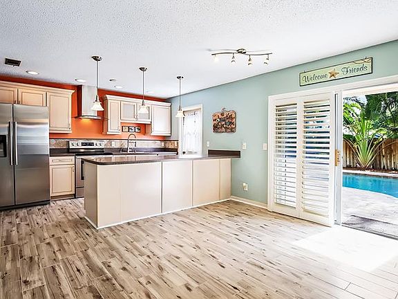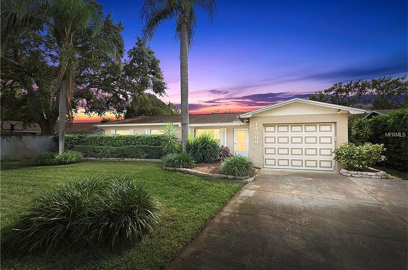 Florida charm and beautiful lush landscaping welcome you to this newly renovated 3 bedroom, 2 bath home in the heart of Clearwater. This well-kept, home provides over 1300 sq. ft. of living space with plenty of exterior space and privacy to spread out & entertain in a resort style setting. Open sightlines and brand new elegant tile flooring welcome you into the living room and separate dining area as you enter the home. Keep an eye on the action at the pool when cooking in the beautifully updated kitchen including recessed lighting, pendulum lights, solid countertops and breakfast bar. The master suite, which includes updated fixtures, is the ideal place to unwind at the end of your day. The master bath features updated cabinetry, brushed nickel finishes, beautiful detailed tile and heated tile floors. A step through the sliding glass door located off of the living room takes you to your own personal resort style get-a-way. Complete with a recently redesigned paver pool deck surrounding a fully refinished salt water swimming pool and lounge area. Enjoy a brisk Florida evening around your built in fire & ice pit or enjoy the ballgame on the big screen while sitting in your fully AC powered, cable ready tiki hut. Two additional bedrooms finish out this perfect Florida home. Located in the heart of Clearwater, this home is minutes away from world-class beaches, amazing restaurants and all of the attractions available in Florida's prime gulf destination.