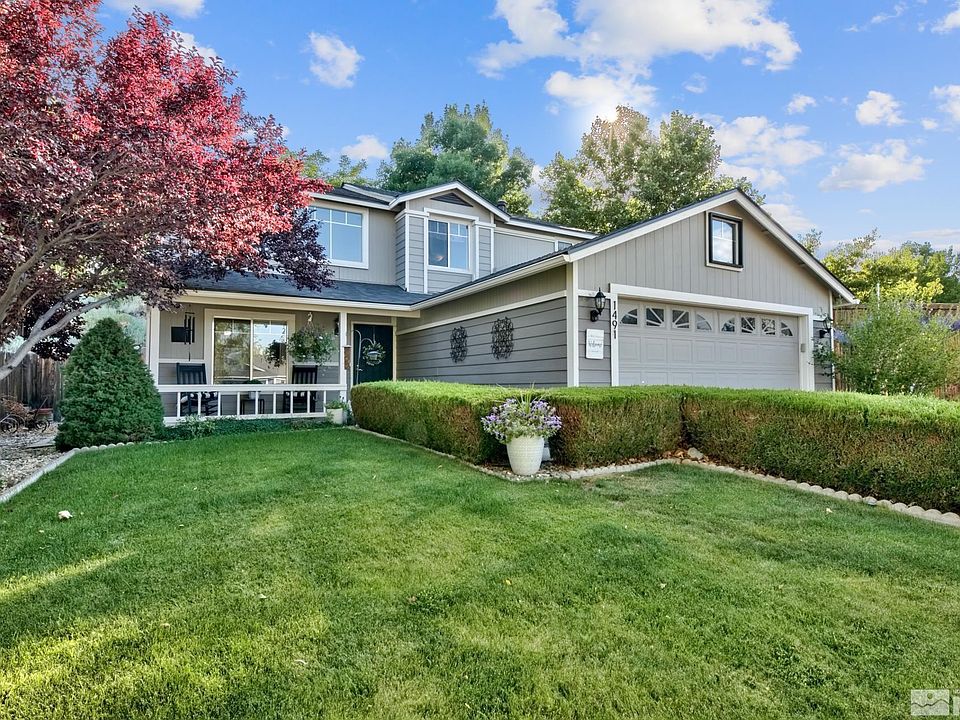 ***OPEN HOUSE Saturday 22 October 11am - 3pm***Seller offering $5000 in closing costs! This sensational mountain view, single-family home is in northwest suburban Reno and only 10–15 minutes from downtown Reno. Mature trees adorn the streets of this highly desirable Northgate subdivision., Conveniently located close to retail shopping and restaurants and just minutes to Westergard Elementary, Billinghurst Middle School, and McQueen High School. The home welcomes you up the sidewalk with expertly manicured privacy hedges to an inviting front porch - enjoy ice-cold lemonade on a summer’s day. The entire property’s thoughtfully landscaped grounds welcome you into this suburban oasis with fruit trees that provide cool shade in the summer and keep you snug in the winter. Upon entering, you are warmly greeted by wide plank wood laminate flooring, neutral paint, and a bright and open floor plan with double volume ceilings. Entertaining possibilities abound in this eat-in, open-air kitchen that seamlessly connects to the dining and living room areas, along with a half bath on main. Storage galore is presented in the kitchen with all the cabinetry and plenty of quartz countertop space. The cook of the house will love the five-burner KitchenAid double oven stove and the herb garden on the side of the house. Through the kitchen sliders you’ll find the inviting, expansive, covered backyard patio. Just off the kitchen leading to the garage is a separate laundry/mud room. In the garage, enjoy extra storage for holiday decorations and room for two cars. Back inside, adjacent to the living room, stairs lead you upstairs as you ascend to the second floor living quarters. Retreat to the en-suite primary bedroom and large walk-in closet with plenty of sitting room. Take in the mountain views whilst upstairs and here you’ll find another full bathroom with two ample sized additional bedrooms. The roof is only four years old, and the water heater is new. Are you ready for the suburban oasis life? Turn the key and welcome home!