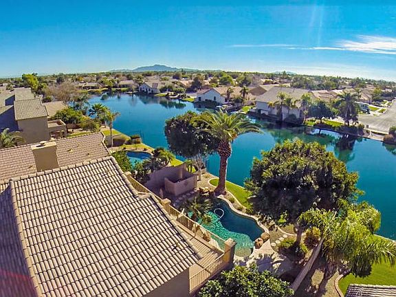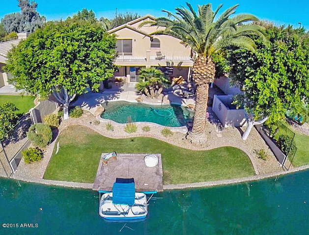 LOCATION!! Highly upgraded home is nestled on quiet interior waterfront lot with N/S exposure. Soaring vaulted ceilings at Entry! LR/DR have Real hardwood flooring and iron/wood banister. Open-concept remodeled kitchen/FR boasts granite, deluxe SS appliances, tiled backsplash, pendant lighting, and 18" diagonal tile. Remodeled upstairs bathrooms feature granite and tile wrapped shower/tub in master en-suite. Oversized 2.5 car garage with workbench and built-in cabinets. Enjoy spectacular pool/lake views from Kitchen/Nook/FR and mountain views from master suite and upper deck. Resort style backyard is an entertainer's delight with updated pool, Shade and Citrus Trees, Mature landscaping, Grassy Area, and Extended sitting pads. Private Boat dock is ready for pedal boating, kayaking,