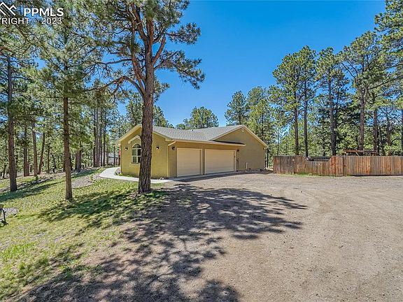 Serenity, privacy and quality that is perfectly perched on a heavily wooded 2.69 acre lot with rolling treed hills and large boulders in desirable Black Forest! Custom built main level living rancher which was positioned on the lot for ultimate privacy with over 3,200 square feet, 4 bedrooms, 3 baths and a 3 car garage. Located in the sought after equestrian friendly community of Spirit Lakes with over 82 acres of community owned open space, 50 ft wide walking/riding trails, two ponds, a softball diamond and picnic areas. Your weekend gatherings will be memorable with the amazing outdoor entertaining spaces including a covered front porch, two back patios and fire pit area all overlooking the beautiful treed acreage with loads of privacy. The main level features neutral paint, real hardwood floors throughout the main level, vaulted ceilings, large windows for tons of natural light and large room sizes. The kitchen has an abundance of cabinets, granite counters, recessed lighting, stainless steel appliances and a pantry. Main level primary suite with a walk-out to private patio, a walk-in closet and a private bath. The room currently used as a dining room could also be used as a family room. It features a walk-out to the backyard, a high end pellet stove and built-in shelving. Main level formal living room with a huge picture window, vaulted ceilings and hardwood floors. Secondary bedroom in addition to the primary on the main level. Fully finished lower level with expansive family room, two additional bedrooms, an office/game area and a 4 piece bath with vanity, jetted tub and separate shower. Back-up 5,500 watt generator included. The property also has a greenhouse, fenced dog run and machine storage yard. The acreage has been mitigated and has rock gardens surrounding the home for additional fire protection as well as a space to showcase beautiful flowers and landscaping. Zoned for horses. RV and outbuilding friendly community. Virtual tours available.