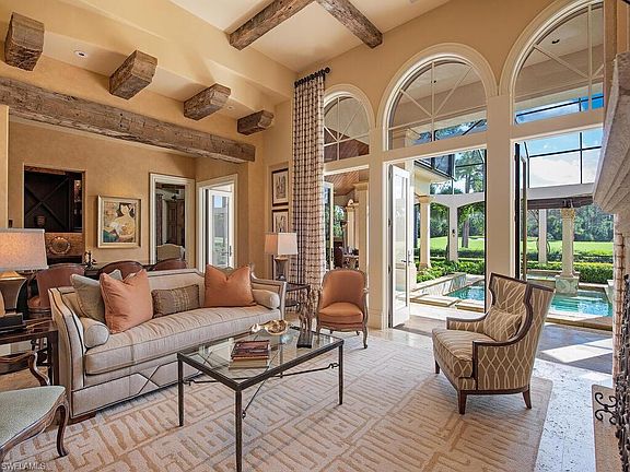 GOLF MEMBERSHIP AVAILABILITY SLOT. Elegance & luxury are immediately evident as you enter the circular motor court of this extraordinary custom-built estate by Kurtz Homes. Professional interior design & exquisite architectural details include volume ceilings, exposed natural wood beams, arched passageways, plantation shutters, French doors & rich wood & natural stone flooring. The formal living room features wood beam ceiling accents & a gas fireplace. The gourmet kitchen is exceptionally designed with wrap around countertops, built in appliances & expansive center island. The spacious family room features disappearing sliders opening to the loggia. This home has two home offices, both with built in desks. A quaint sitting area in the master suite is surrounded by windows & golf course views. An expansive master bath features his & her vanities, large soaking tub & walk-through shower. The outdoor living spaces have been thoughtfully designed for endless entertaining. Gather around the outdoor fireplace and summer kitchen under the loggia & on the multi-level lanai around the magnificent pool & spa. Southern exposure golf course views punctuate this already incredible estate.