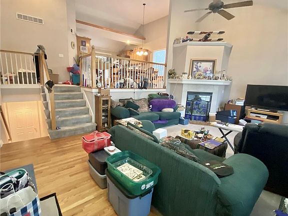 Beautiful 3 bedroom, 2 bath home on a quiet street. Inside you will find beautiful hardwood floors, vaulted ceilings, a cozy fireplace and large windows allowing plenty of natural light to come inside. Kitchen eat in area for dining and all appliances stay in the kitchen as well as the washer and dryer! Master bedroom is on its own level, has large windows, a vaulted ceiling, private full bathroom with a jacuzzi tub, shower room, & large walk in closet. 1208 sq ft walkout basement is stubbed for a bathroom, and framed just needs sheetrock and its ready for you to create the space you desire. Has a sub basement with egress window and sump pump. No HOA fees! Wooded backyard provides plenty of privacy. Conveniently located with quick and easy access to interstate.