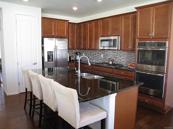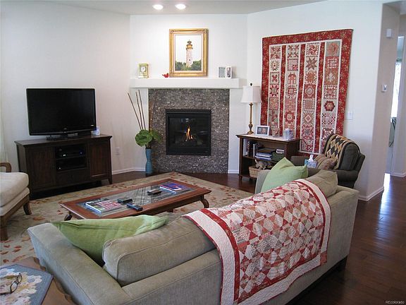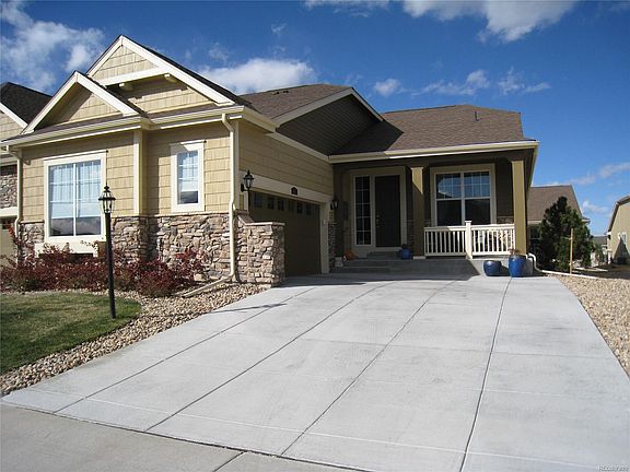 Beautiful paired ranch home in quiet location on extra wide lot. Yard fully maintained by HOA, snow shoveled in winter. Elegant finishes in gourmet kitchen, cherry stained cabinets, granite counters, stainless steel appliances, gas cook top, double wall ovens, large island to enjoy open sunny great room. Gorgeous Hardwood floors in entrance, kitchen, living, dining areas. Master suite w/large walk-in shower, double vanity, walk-in closet with access to laundry & front load Washer/Dryer. Dining area sliding doors open to large covered back deck to enjoy the extra wide lot. Full unfinished basement with $2000 lighting & 4 electrical outlets added, $2000 front load W/D included. 2 1/2 car garage has room for a workshop & golf cart. Heritage Todd Creek is 55+ active community with Clubhouse and community pool. You can dine out, play golf, learn a hobby, exercise. Covered front porch faces HOA open space across the street. Roslyn Way is off Quince Way and off East 148th Place.