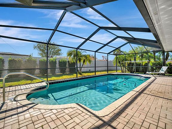 This sun-drenched getaway offers a spacious living area with pool views, a chef's kitchen with marble countertops and stainless appliances, and a fenced backyard with a BBQ grill. The kitchen is fully equipped with a double-door fridge, oven, stove, microwave, Keurig and drip coffee makers, blender, kettle, all cookware, silverware, plates, and seasonings. Enjoy the screened-in pool, outdoor dining table for 6, loungers, poolside cocktail chairs, and a ceiling fan on the patio. Beach towels and chairs are included for your convenience. A washer and dryer are available for your laundry needs.