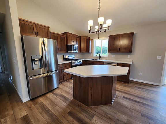 New construction lookout rambler located in a quiet country neighborhood near the Sherburne National Wildlife Refuge. This plan features three main level bedrooms with a potential for two additional bedrooms and a bathroom in the basement. The primary bedroom has a private 3/4 bathroom along with a walk-in closet. The hallway closet is roughed in for a stackable washer/dryer. Durable luxury vinyl plank flooring in the kitchen, dining room and entry. The kitchen boasts a pantry, center island and rustic maple cabinetry. Kitchen appliance package plus a washer and dryer is included. The living spaces have vaulted ceilings with a ceiling fan/light in the vault. Finishes include white enameled trim/baseboards, white panel doors and wood staircase rails with metal spindles. The garage is 24' deep on the double stall and has insulated walls. This is your chance to own an affordable new home.