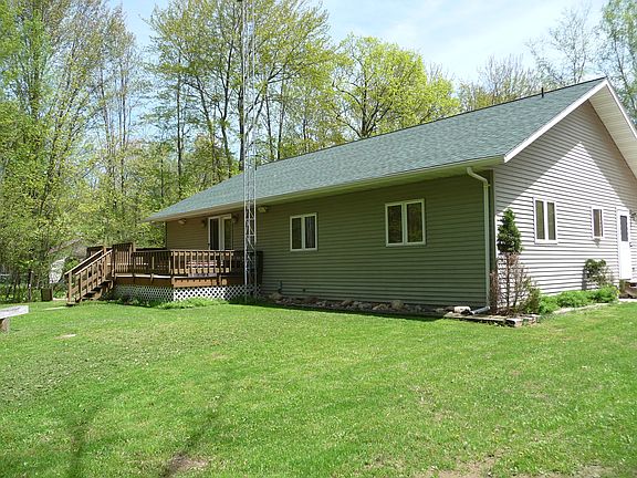 PRICE REDUCED to $134900!!! OPEN HOUSE: OCTOBER 27, 12-3 pm One owner, 1993 ranch home (1,586 sq ft.) on 2.5 wooded acres across from the Nicolet Forest. Large yard with volleyball court, front and back fire pits, horseshoe pits, and large trail through the back woods. This is a 3 bedroom/2 full bath home with 1st floor laundry, deck with hot tub off the master bedroom (facing the back) and 3-season room. Kitchen, bathroom, and master bedroom newly repainted. The 30x40 detached garage with 10’ sidewalls is insulated with a loft and Modine heater. New roof Sept. 2009. Appliances included (2010 refrigerator, ‘93washer, ’98dryer, ’07 gas range, ’93 dishwasher). Also included in sale: basement workbench, shelving/ peg board, florescent lights, garage work bench, and Modine heater in garage. Included in sale is outdoor wood burner.