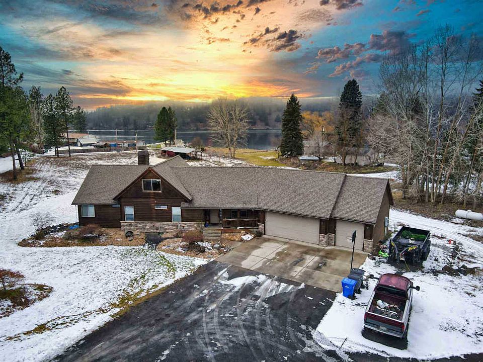 Beautiful Nine Mile Falls lakefront home on 7.6 acres sitting on Long Lake with private shoreline access to the lake. This home offers 4 beds & 3 1/2 baths with 3,852 sq ft of living space on 3 levels including a full daylight walkout basement. The basement has a bar area, fireplace, plenty of windows, and sliding glass door leading outside to the back yard. The massive windows in the living room look out to the expansive open deck with views of the Lake. Living room also features vaulted ceilings with tongue and groove wood design as well as a stone fireplace for cold winter nights. The kitchen has granite counters, tile backsplash, a walk-in pantry, and a large window with views. Master suite with vaulted ceiling, a door leading to the back deck, and bathroom with a large soaker tub and a tiled walk in shower. The home has an attached 3 car garage and there is a 30x40 shop on the property as well. There are two wells on the property and full RV parking and set up with its own well, power, and septic.