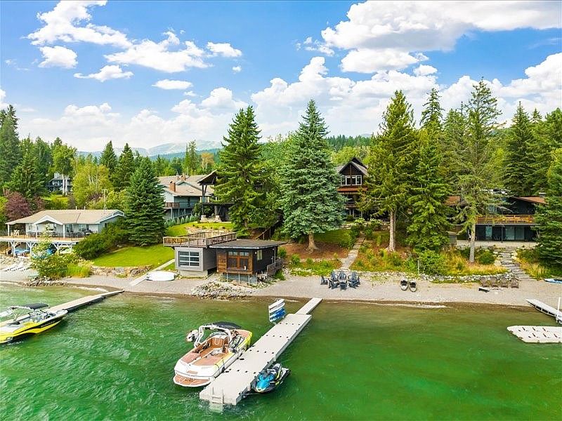 Lakefront Monk’s Bay Treasure! Serene lakefront living, with 70’ of pebbled beach frontage combined with the vibrant amenities of downtown Whitefish, Iron Horse, and Big Mountain minutes away. Offered fully furnished and turnkey, this 6-bedroom, 4-bathroom waterfront home blends rustic elegance with a comfortable family and entertaining atmosphere. Bonus- boat house! Enjoy the perfect mix of mountain modern design, warmth, and high-end finishes throughout, offering two office spaces (one of which counted as a bedroom), and an open, airy main-level floorplan. Appliances include a wine fridge, Meile coffee station, steam oven, 2 washers and 2 dryers. Whether enjoying the panoramic mountain and lake views or making use of the lawn, and expansive deck, this property offers a true connection to the waterfront. Experience Whitefish lakeside luxury, and enjoy the tranquility of out-of-town living, combined with the convenience of in-town amenities, gifting the best of both worlds. Call Sean Averill, 406-253-3010 or your real estate professional for more information.