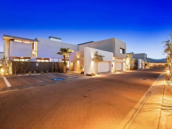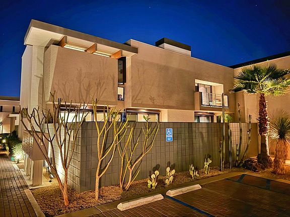 Central Park meets Palm Springs. Discover the epitome of luxury at 48@Baristo, a prestigious low density gated community w/2 Architectural Awards (DesignArc). This stunning home merges modern elegance w/mid-century design, featuring sculpted landscapes. It offers a versatile layout w/a primary BD En-suite main level, a 2nd En-suite upstairs, + a loft w/a full bath, suitable as a 3rd BD/office/gym. The west-facing unit promotes lots of natural light, and mtn views. Great indoor/outdoor living opening to a pool/spa, and outdoor fireplace, perfect for entertaining.Refinement plus sustainability and extensively upgraded: a high efficiency owned 22-panel Solar, a Solar Inverter, 2 wall batteries, ensuring green, cost-effective living. The home's elegance is highlighted by bamboo flooring, Lutron dimmers, a smart home system controls the pool/spa, heating/air conditioning remotely. Other features: a high-capacity Pool Heater, brand new AC in the garage, freshly painted interiors, a Ring video doorbell, exterior sunshades w/automatic timers, retractable screens, custom-built cabinetry, and a home sound system. Located in central Palm Springs, this statement of refined living is moments from vibrant downtown, offering fine dining, wine bars, cafes, cultural attractions, and leisure facilities. Low HOA (earthquake ins, roof, water, basic cable/internet), financially robust reserves (close to half million dollars + close to 100% funded). The ultimate lavish living. You own the land.