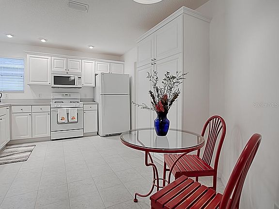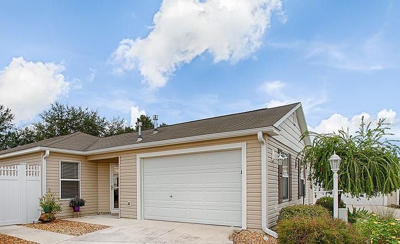 This is a lovely TURNKEY 2/2 Amelia courtyard Villa located in the Village off Duval. Rosedale Villas is conveniently located between Lake Sumter Land and Brownwood Squares, Seabreeze Recreation Center, Duval Pool and numerous golf courses The kitchen has white cabinets featuring an extra large cabinet with pullout drawers for additional storage, a gas range, all white appliances, plus a eat in area. The volume ceilings in the living and dining area make this villa seem even more spacious and is fully furnished and is ready to move in for you or your tenant. This floorplan features two bedrooms, each with their own bath and a large walk-in closet in the master bedroom. The lanai has been expanded with a bird cage that makes the outdoor screened area perfect for dining or just enjoying your private yard. The garage is large enough for a car and a golf cart and has a remotely controlled garage screen in addition to the garage door. New air conditioning system in 2017