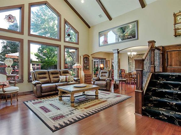 Absolutely stunning 2008 custom-built home in quiet cul-de-sac. No detail overlooked during this construction! Beautiful wood floors, iron trim accents, unique stone, granite countertops, upgraded wood trim and architectural windows adorn throughout. Main floor showcases a sophisticated vaulted and beamed ceiling and a 2-story floor-to-ceiling stone-faced fireplace flanked by trim and cabinetry. Kitchen has long eating bar, spacious pantry, prep island and ample granite counter space. Kitchen adjoins the cozy family room with bay window and view of lush backyard. More gathering space is found in the living area again showcasing fabulous windows to bring the outside in. Formal dining, still in an open floor plan, rounds out the main living space. Master, with access to the patio, has fireplace and large bath with separate tub/shower, 2 sinks and a spacious walk-in closet. Upstairs find 2 bedrooms and a bath along with luxurious office space with dormer windows that could serve as a 4th bedroom. All window treatments and wood blinds will remain as well as TV mounts. Home is wired for surround sound for your entertainment! Main floor laundry, a separate room, doubles as a storm shelter. Full-fenced backyard with over $15,000 in landscaping, offers a paver patio, an octagonal pergola, gazebo, a variety of maturing trees, manicured landscape and a water feature which will remain. Irrigation is on a well for huge utility savings! Downspouts in backyard are buried to drain to the street. Attached side-load garage is insulated, shingles are Class IV hail-resistant which qualify for insurance discounts. Sellers were proactive and installed a Sentricon bait system and warranty will transfer. Heating is provided by a number of high-end systems: radiant floor heat is available throughout the main floor and a heat pump and forced air furnace serve different zones of the home. Located near schools and quick highway access. Best of all, an 11-year-old home with NO SPECIALS! Call for a private showing today!