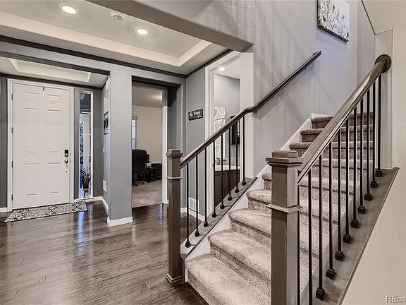 Welcome home to this stunning 2 story home located in the highly desired Sierra Ridge neighborhood. Loaded with extensive hardwoods, covered back patio and a home with positive environmental impact with solar. Located on a premium lot this home has amazing views of the mountains from the upstairs bedrooms and a 1 min walk to Sierra Ridge Park. Offering 5 bedrooms and 4 bathrooms this home has it all. Walking in the foyer you feel the open concept with tons of natural light and extensive hardwood flooring. The great room offers vaulted ceilings and a cozy gas fireplace. The spacious kitchen with smoke colored cabinets has a nice size walk in pantry, stainless steel appliances, granite countertops and a large island. Walk through the nook to access the covered deck which is great for entertaining or just to enjoy coffee on your covered deck. There is a convenient pocket office near the kitchen with a built in desk and plenty of storage. The main floor offers a large bedroom with an adjacent full bath that can be used for guests, a great office space or playroom. The second floor provides four bedrooms including the master suite including a 5-piece ensuite with a soaking tub and TWO walk-in closets. The second bedroom has its own attached private full bathroom and third and forth bedrooms share a Jack and Jill bathroom. The basement features large windows and is ready for your personal touches. It has tons of natural light, rough in plumbing for an additional bathroom and tons of storage space. This home is upgraded with solar panels, extended wood flooring, smart thermostat, and smart lock front door and a beautiful covered back patio. There is a 3 car tandem garage and a sprinkler system in the front and back. Location is key with quick and easy access to I-25 and less than a 15 minute commute to the Denver Tech Center. Showings start Friday 6/10/22.