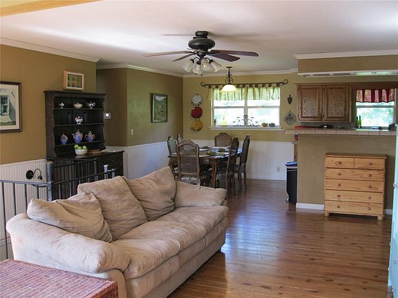 Beautiful 5 bedroom/2 Bath country home in park-like setting on 4 acres of privacy. This "Land a Goshen" home has giant Oaks, Magnolia and Catalpa trees...Plus: Plum & peach trees. Sit on your shade-filled deck high above the ground and enjoy the landscaped front yard and country views! Upstairs is main residence and downstairs has 2-car garage and another living area or guest apartment (with a complete kitchen!). Must see this gem that has it all!!