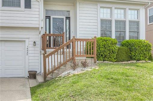 Bright, open floor plan in Blue Valley schools! 3 large bedrooms & 2 full baths. Master bath has double vanities and a walk in closet. Living room with vaulted ceilings, lots of natural light and a cozy fireplace. Finished basement for additional office area or play room. Also has plenty of unfinished space for storage, plus a storage shed under deck and an over-sized garage. Newer roof, gutters, paint & garage doors. Neighborhood pool & clubhouse. Great home for an unbelievable price! Refrig, W/D are all staying!